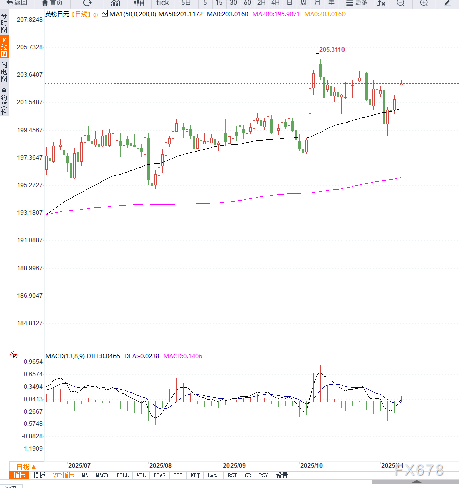 若汇价有效突破203.60 区间阻力,则可能延伸上行至 205.00附近阻力。下方支撑关注 202.00附近,如跌破可能回探 200.00 心理关口,但整体短线多头仍占主导。