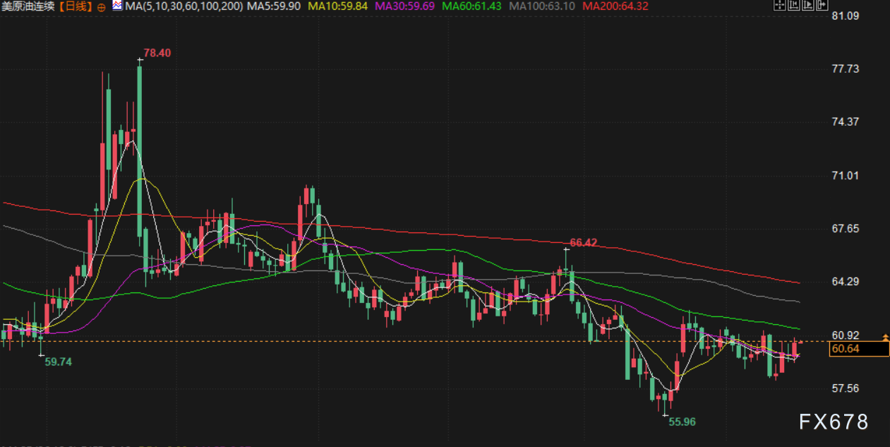 周二油价在多重因素影响下震荡收高。截至收盘,布伦特原油期货上涨1.07%,报收每桶64.89美元;美原油期货上涨1.39%,报收每桶60.74美元,盘中一度触及60.92美元高点。