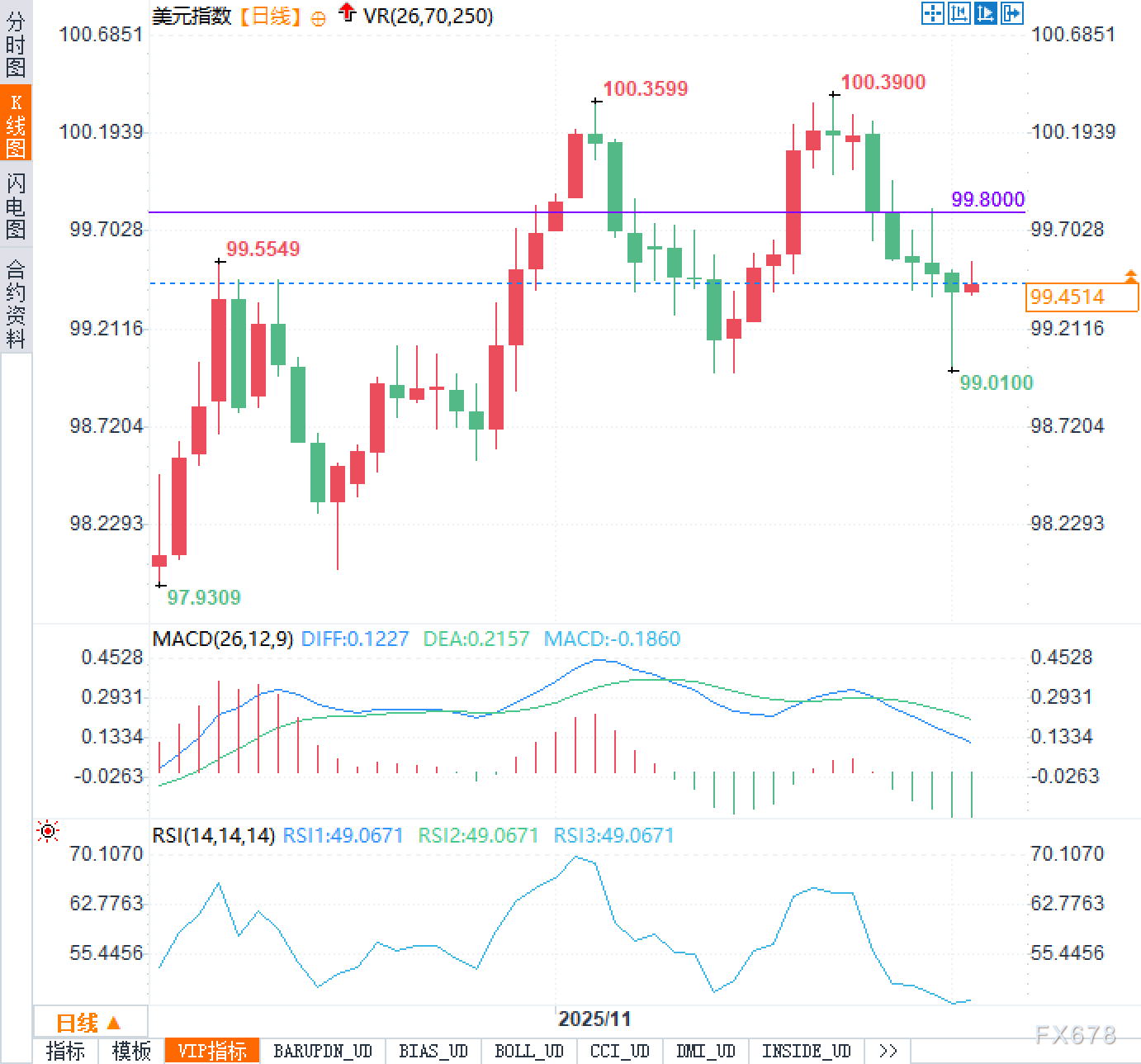 MACD柱体已由红转绿,快慢线在零轴上方死叉并有继续向零轴靠拢迹象,反映多头动能明显减弱,行情进入高位震荡及修正阶段。RSI回落至50附近中性区域,短期并无极端超买或超卖信号,说明多空力量相对均衡,后续需观察指数在99.0–100区间的运行轨迹,是选择构筑高位整理平台还是演变为更大级别的回调结构。整体来看,当前更偏向情绪消化和方向酝酿阶段,价格与指标的背离及关键价位的得失,将为之后的趋势选择提供信号。