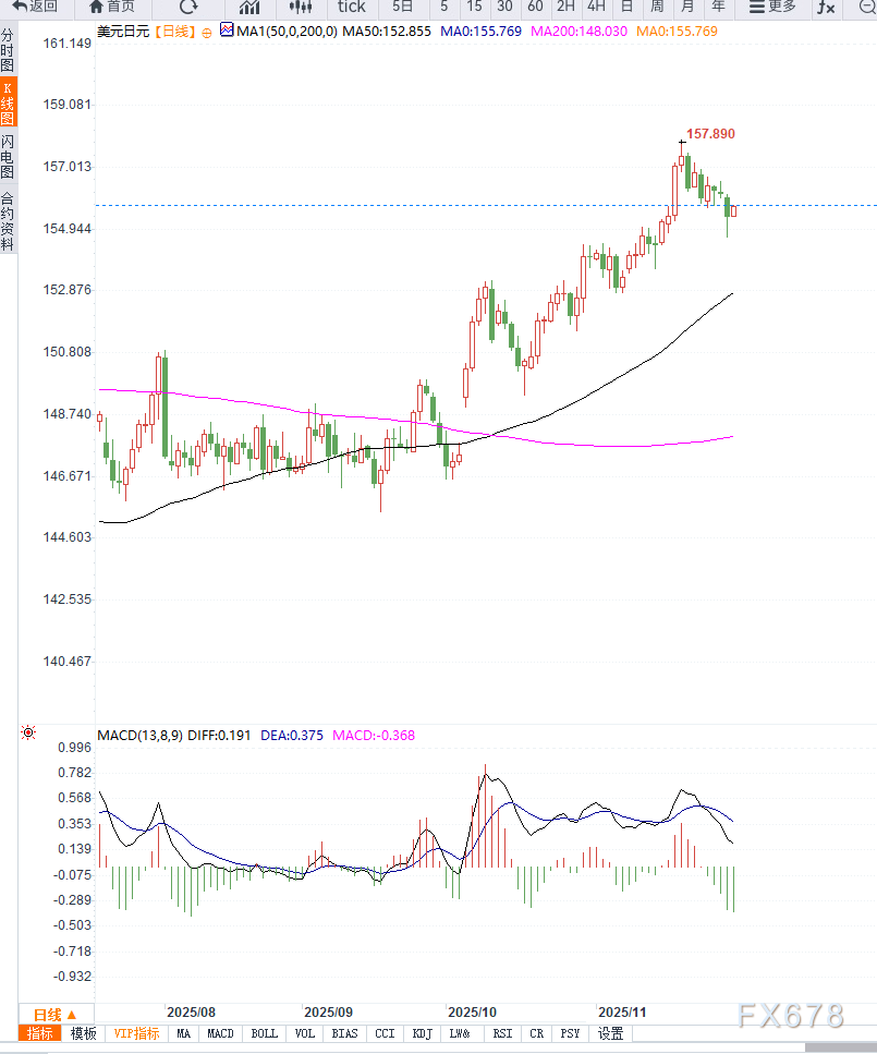 据市场调查显示,投资者认为美联储12月降息25个基点的概率已升至 近88%,进一步削弱美元吸引力。美国经济降温与日本加息预期形成鲜明对比,使美元兑日元上行空间受限。