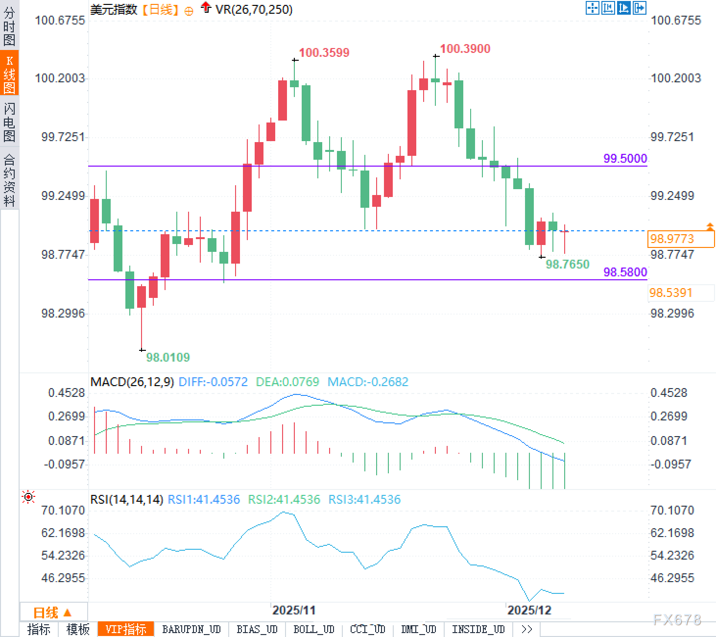 汇通财经APP讯——12月8日,星期一美市盘前。美元指数目前交投98.98附近,正处于一个关键的观察窗口期。尽管近期美国12月消费者信心有所回升,密歇根大学公布的数据显示信心指数升至53.3,显示出部分乐观情绪,但这并未改变整体疲软的基本面。分析认为消费者信心这一反弹主要得益于政府停摆结束带来的短期心理安慰,并不能说明民众对经济前景真正恢复信心。