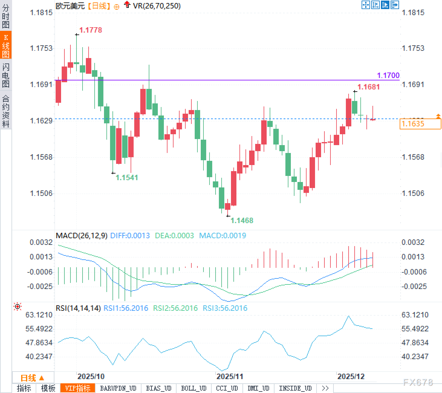 指标上,MACD指标处于零轴上方的正值区间,DIFF为0.0013、DEA为0.0003、柱状图为0.0019,显示多头动能仍在扩散,但“扩散速度”需观察是否开始钝化;RSI为56.2016,位于中性偏强区域,既未超买也未超卖,更符合“上升趋势中的整理”特征。综合来看,结构偏多、位置偏敏感:1.1615守与不守,决定汇价是走上升通道内的健康回撤,还是转入更大级别的横盘趋势甚至二次下探。