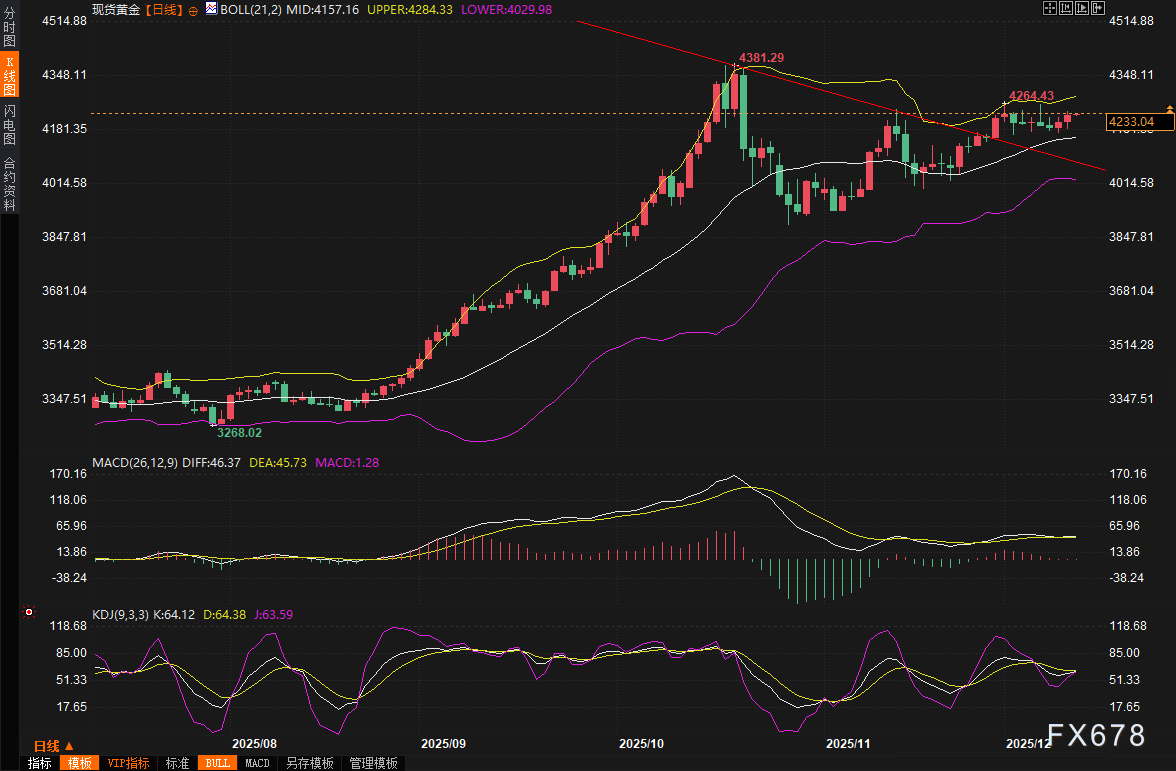 在美元与美债收益率双双走弱的背景下,现货黄金快速收复早盘失地,盘中最低下探4182元/克附近后强劲反弹,最高触及4238.59美元/盎司,创近三个交易日新高,最终收报4228.47美元/盎司,单日涨幅约0.5%。现货白银表现更为亮眼,一举突破并站稳61美元整数关口,最高触及61.92美元/盎司,刷新历史纪录,今年以来累计涨幅高达113%。周四(12月11日)亚市早盘,现货黄金窄幅震荡,目前交投于4230美元/盎司附近。