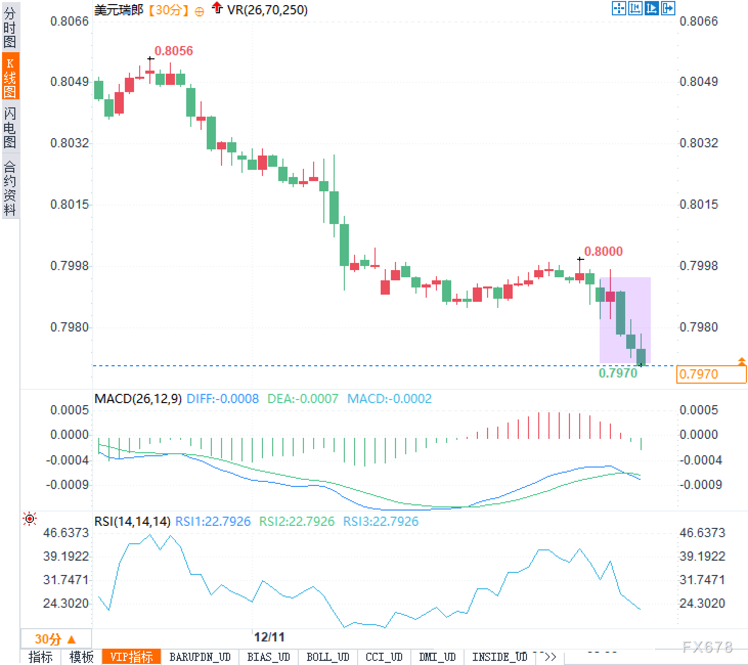 从技术形态观察,美元兑瑞郎近期呈现出明显的下行趋势。汇价自0.8056附近的阶段性高点一路走低,在过去3个交易日内累计下跌近1%,目前测试0.7960一线的支撑。从30分钟周期图表来看,汇价在0.8000心理关口附近遭遇较大抛压,多次上攻未果后加速下行,短线空头动能占据主导地位。