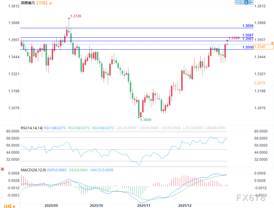 当前英镑/美元汇率交投于1.35美元关口上方,日内波动区间大致在1.3520美元至1.3560美元。此轮上涨主要受益于美元走软以及市场风险情绪回暖。美元疲软态势与美元指数回落密切相关,同时市场对美联储将在2026年下半年开启降息周期的预期升温,也对美元构成了全面压力。