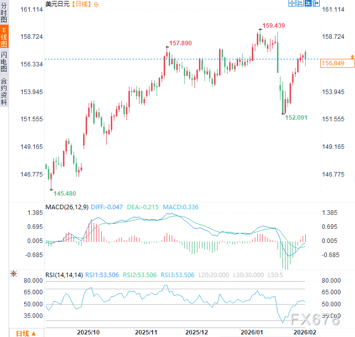 周一亚市时段,美元兑日元冲高回落,一度上涨0.3%触及157.65,为逾两周新高,随后转跌,目前交投于156.80附近,跌幅约0.25%。