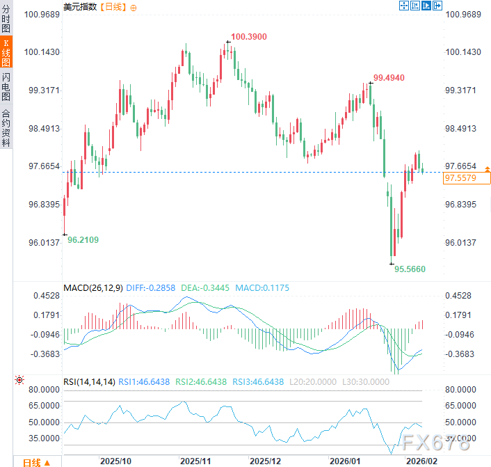 周一(2月9日)亚市早盘时段,美元指数于97.55附近窄幅震荡。